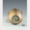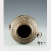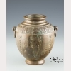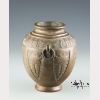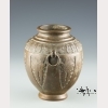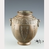 The vase cast in low relief to show six spearhead shapes with a key fret design to the body and a similar key fret border to the shoulder, with two lug handles on the shoulder with a loose ring hanging from each, with a flared foot. Approx. 8 1/4 by 6 1/4 in., 21 by 16 cm.