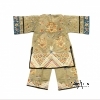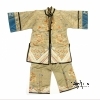 The set with a beige ground robe and pants, the robe with six sinuous dragons, auspicious symbols, waves and lishui stripe, with button closures, the pants with two sinuous dragons, auspicious symbols, waves and lishui stripe, with elastic top. The robe approx. 41 by 54 in., 104 by 137 cm.