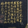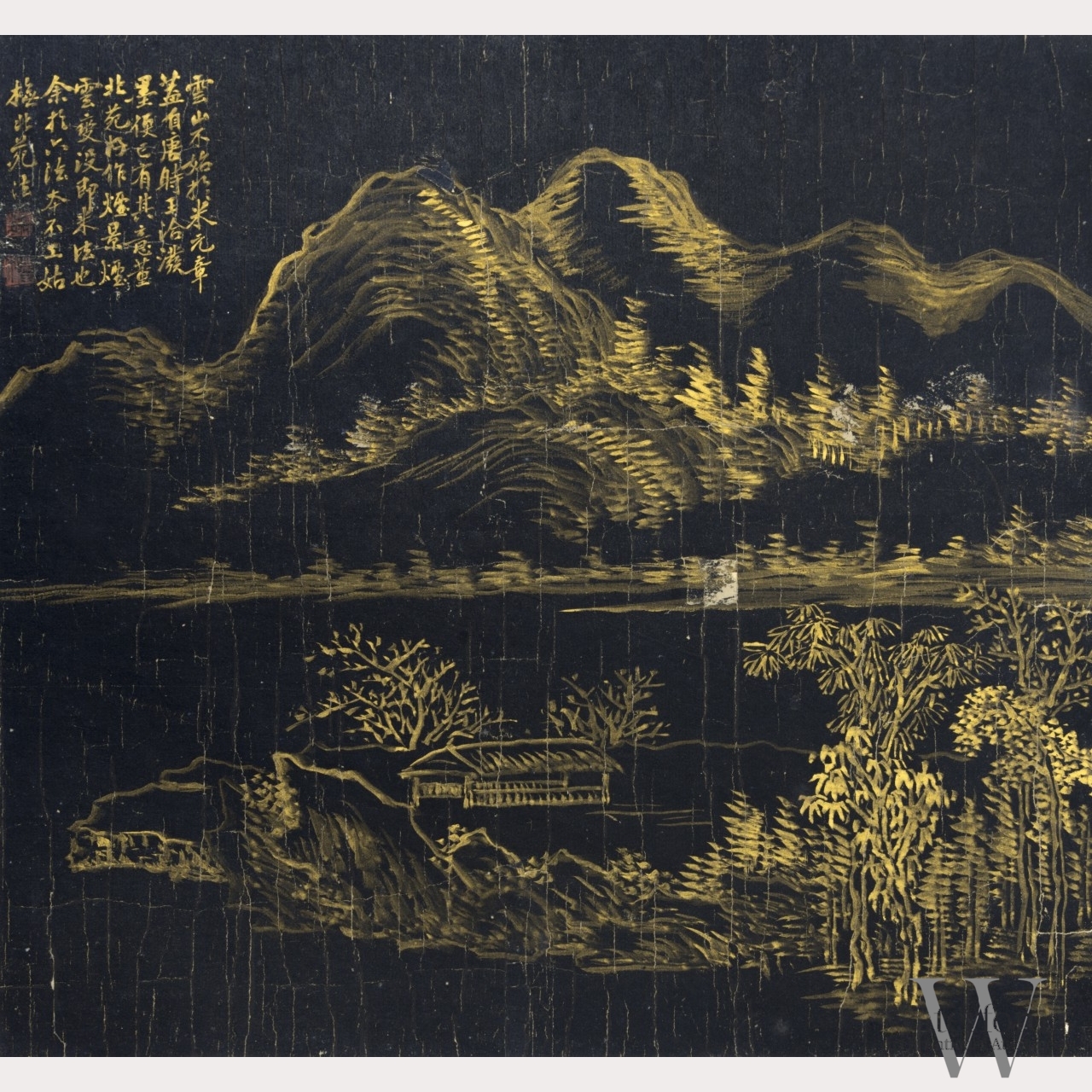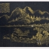 Qing dynasty, ink and color on paper. The painting of a Chinese landscape done in gold with a black backdrop, with poetic inscription originally written by Dong Qi Chang and two artist seals, mounted on paper. Approx. 10 3/4 by 11 1/2 in., 27.4 by 29.3 cm.