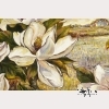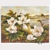 Oil on canvas. The large contemporary painting shows white magnolias blooming in the foreground with a lake and a village in the background, with "Wen Ze Chen" signed to the lower left. Approx. 35 7/8 by 47 3/4 in., 91.2 by 121.4 cm.