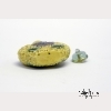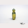 The porcelain snuff bottle is carved with a meander bearing green leaves and a brownish-red lotus flower on yellow ground, with green stopper. Approx. 2 3/8 by 2 in., 6 by 5 cm.