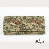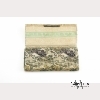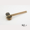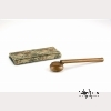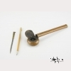 19th/20th century. A travelling scribe's copper pen and inkwell set, the top to the flattened circular well revealing the compartment for the brush and paper cutter, unadorned save for the small silver endcap, together with a silk brocade purse with silvered mirror. The purse approx. 3 in. by 6 1/4 in., 7.5 cm by 15.6 cm.