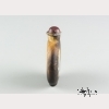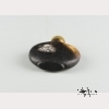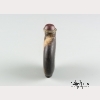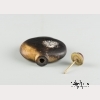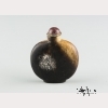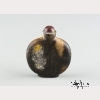 The snuff bottle of flattened globular form made from a smooth stone with dark brown, camel and white color with black crackle, with red stopper in a brass collar and brass spoon. Approx. 2 7/8 by 2 3/8 in., 7.5 by 6.2 cm.