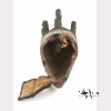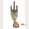 The mask with white paint to the face, with three large arches atop the head and fabric hanging from the chin. Approx. 22 1/2 by 7 1/4 in., 57 by 18.4 cm.