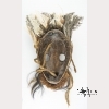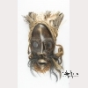 The wooden mask with pierced eyes, large nose and large pierced mouth, with hair, rafia and cloth embellishments, the head adorned with feathers to the top of the head, with holes to the edges and hardware to the back for hanging. Approx. 13 3/4 by 6 1/4 in., 34.7 by 15.7 cm.