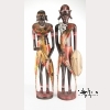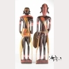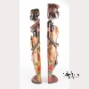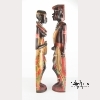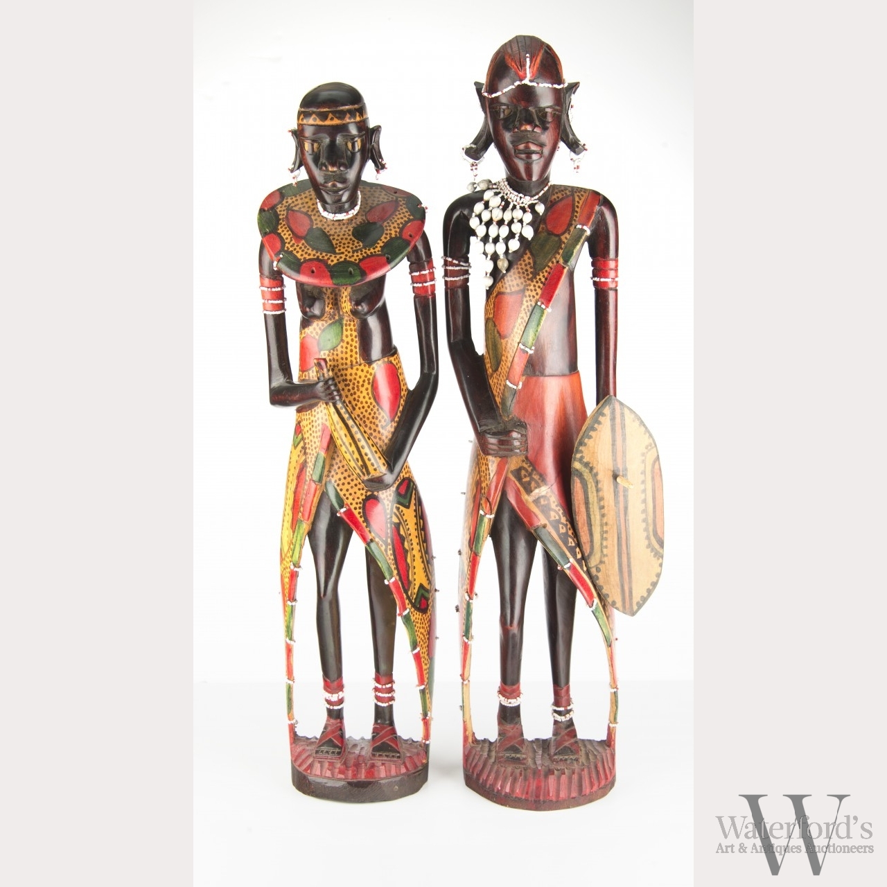 20th century. The male and female pair are painted with shades of red, yellow and green, adorned in red and white beaded jewelry, with large eyes, elongated earlobes and wearing headdresses and long garments, the male holding a shield, the female holding a gourd. The male approx. 25 1/2 by 5 3/8 in., 64.6 by 13.5 cm.