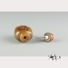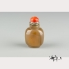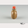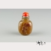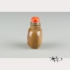 The snuff bottle of flattened square form with a child at play and a bat descending from heaven carved to one side, on an oval foot ring, with a coral top, stopper, brass collar and spoon. From the Christian Collection, Middleborough, MA. Approx. 2 3/4 by 1 1/2 in., 6.9 by 3.7 cm.