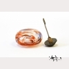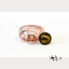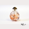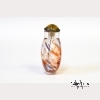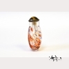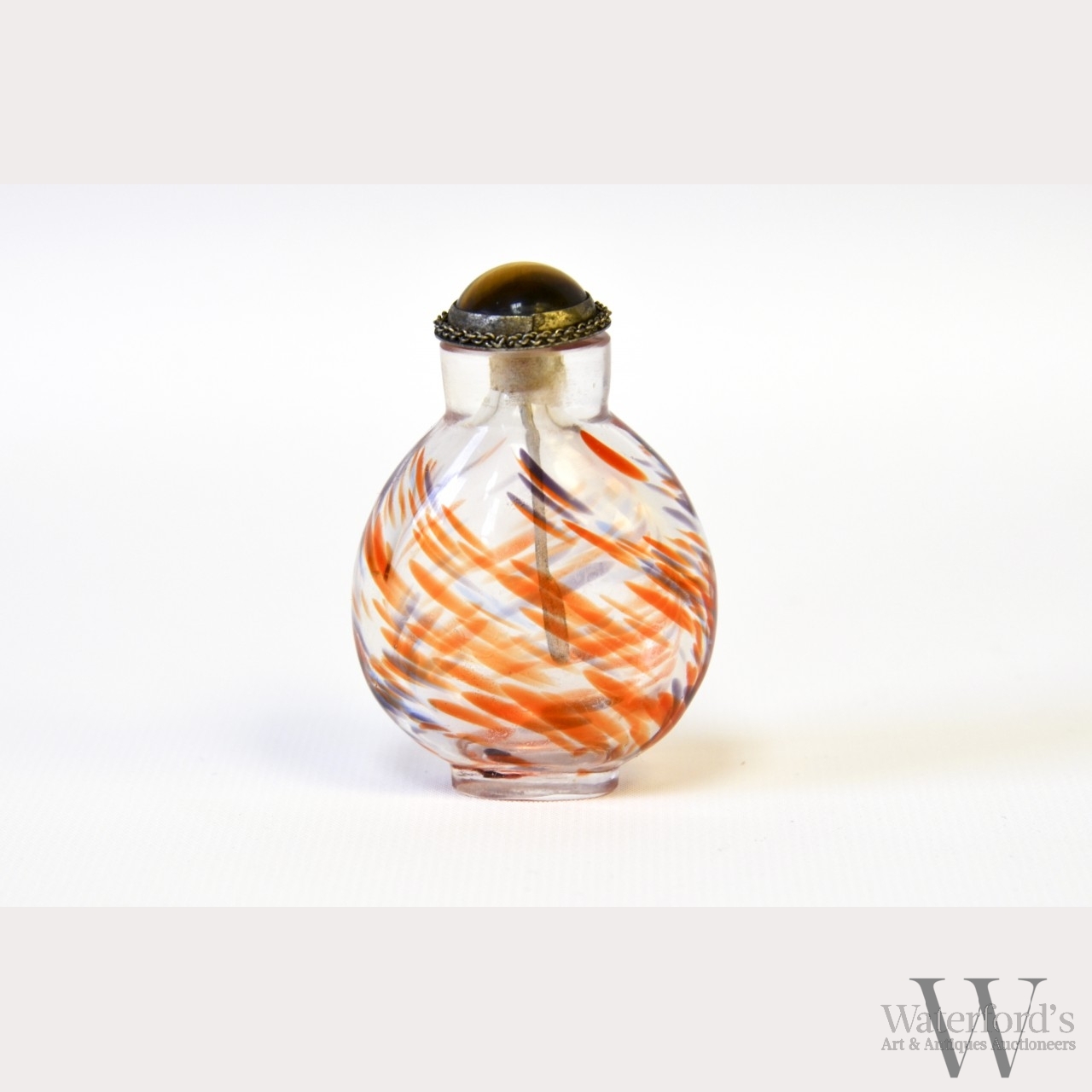 The clear glass snuff bottle with orange and purple streaks around the body, with a tiger eye stone top in metal chain link border, stopper and spoon. Approx. 2 3/4 by 2 in., 6.9 by 5 cm.