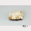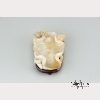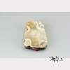 19th/20th century, late Qing dynasty. The small white jadeite tray in the form of a curled lotus leaf with stem, blossom and seedpod, with russet and grey mottling, on a wooden stand. Approx. 3/8 by 3 3/8 in., 1 by 8.6 cm.