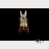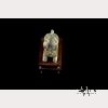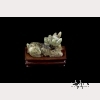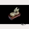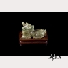 The pen rest in the form of a small, recumbent dragon carved to show scales to the mottled jade body, looking over his shoulder with mouth slightly open and large eyes, with custom wood base. The jade approx. 1 1/4 by 2 in., 3.3 by 5.2 cm.