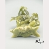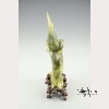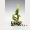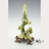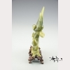 The carving shows two birds perched on thick branches, their bodies carved in low relief and mouths slightly open, the branches with thin leaves blooming, the jade resting on a custom wood base acting as an extension of the branches or tree roots. The jade approx. 9 5/8 by 4 1/4 in., 24.5 by 11 cm.