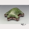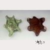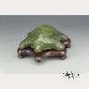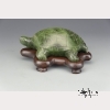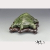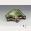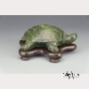 A lively carved turtle with head, tail, shell and four feet, on a custom wooden stand. Approx. 7 by 5 1/4 in., 17.8 by 13.4 cm.