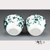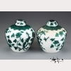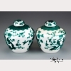 19th century, Qing dynasty. The pair of white glass ginger jars of squat ovoid form with short, narrow necks and domed covers, all with green overlay, the bodies decorated with a phoenix perched on peony branches and song birds among plum branches, with a ruyi head border to the necks, on recessed foot-rings. Approx. 5 1/2 by 5 in., 14 by 12.7 cm.