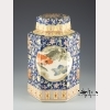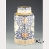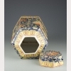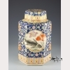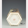 The hexagonal jar with foliate scroll and a lotus to the lid, the body with foliate scroll and two cartouche, each containing one red and one black koi, with a fret border to the rim and bottom, with Qianlong marks to the base. Approx. 13 3/4 by 8 in., 35 by 20.4 cm.