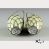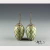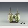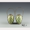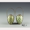 The two vases of meiping form with a celadon glaze encased in woven bands of silver to create a diamond diaper pattern, with a twisted rope-style silver handle to each, with a four character mark in underglaze blue to the bases. Each vase approx. 4 1/4 by 2 3/8 in., 10.9 by 6.2 cm.