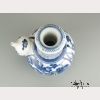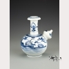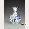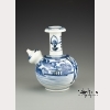 18th century, Qing dynasty. A porcelain kendi with a globular body rising to a tall trumpet neck and set at the shoulder with a mammiform spout, decorated in underglaze blue to depict landscapes and floral sprays. Approx. 9 by 7 in., 23 by 18 cm.