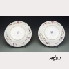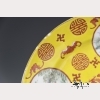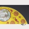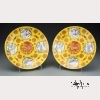 19th century, Tongzhi period. The porcelain plates with an imperial yellow ground, decorated with an iron red central roundel of a dragon chasing a gold flaming pearl, with twelve iron red shou knots of longevity, twelve Buddhist sauvastikas and twelve auspicious bats, with four roundels decorated in famille rose enamels to depict people in landscape settings, the rim with overglaze gold band, the reverse decorated with three famille rose floral sprigs, on a circular foot ring, with four character "jixiang ruyi" mark to the base. Each approx. 1 1/4 by 7 1/2 in. diam., 3.2 by 19 cm. diam.
