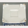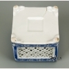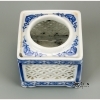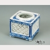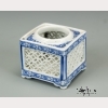 19th century, Qing dynasty. The square jar with interlocking coin pattern reticulation on the sides, resting on four bracket-shaped feet, with a round rim, with underglaze blue decoration. Approx. 2 1/4 by 2 1/2 in., 6 by 6.5 cm.