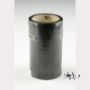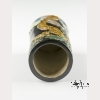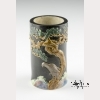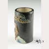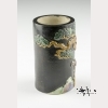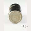 The thickly potted cylindrical brush pot with a black ground and molded decoration of an eagle on a pine tree with mountains in the distance, with three character Wang Bing Rong signature to the base. Approx. 4 1/4 by 2 1/2 in. diam., 11 by 6.5 cm. diam.