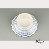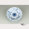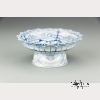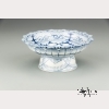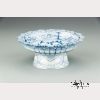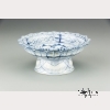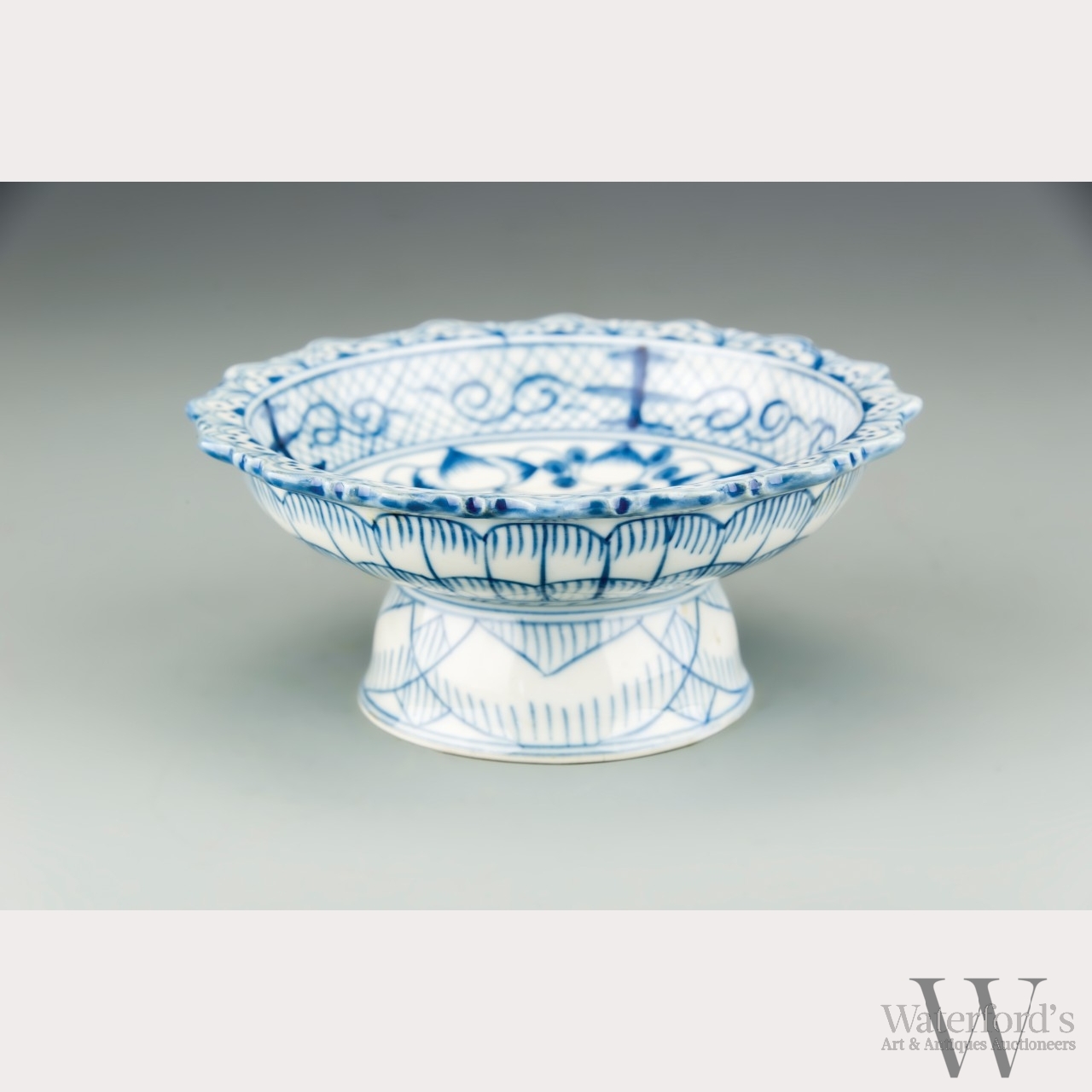20th century. The porcelain dish with foliate rim on a tall foot ring, decorated in underglaze blue with four "wang" or "king" characters equidistantly spaced against a cross-hatched background, surrounding a border of peaches, the exterior decorated with painted lotus petals. Approx. 2 1/2 by 6 in., 6.5 by 15 cm.