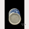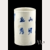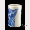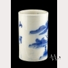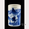 The brush washer painted in underglaze blue to show a mountainous Chinese landscape, with an inscription that translates to "green hills" and "clear water" on the reverse. Approx. 4 5/8 by 3 in. diam., 11.9 by 7.7 cm. diam.