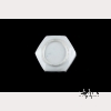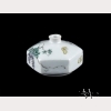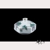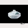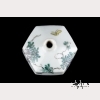 The hexagonal water coupe with hand painted wisteria and two yellow butterflies to the top and sides, with a small mouth to the top center. Approx. 1 3/4 by 2 1/4 in., 4.5 by 5.9 cm.
